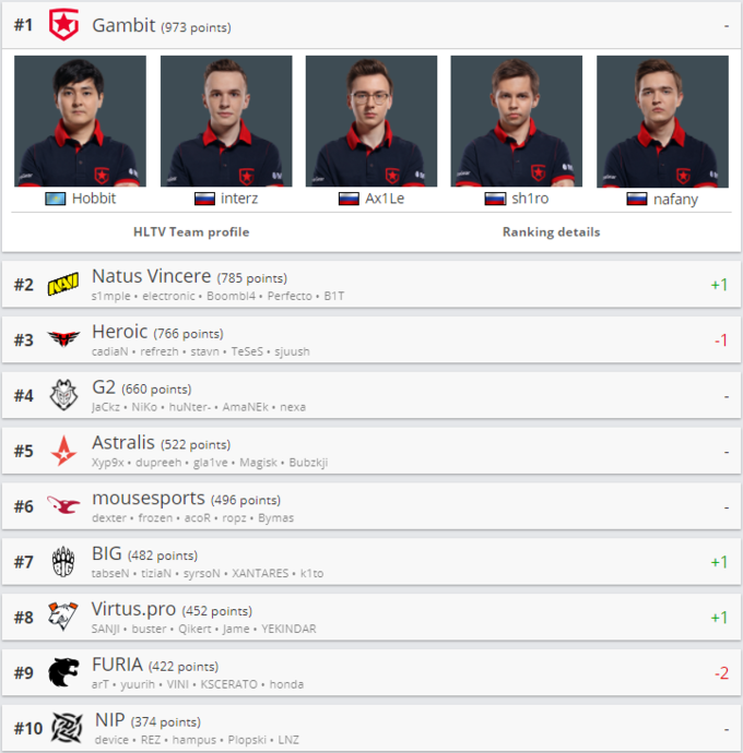 Natus Vincere обійшли Heroic в рейтингу команд з CS:GO від HLTV.org і посіли друге місце. Лідером списку залишилася Gambit Esports, яка випереджає склад Олександра s1mple Костилєва на 188 очок.