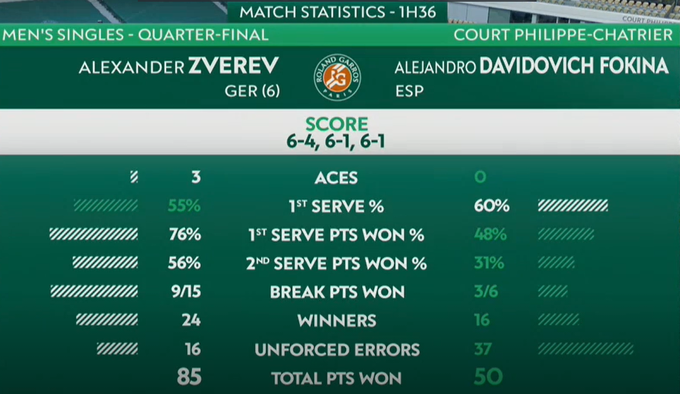 Німецький тенісист Александр Звєрєв (№6 ATP) здобув легку перемогу в матчі 1/4 фіналу Ролан Гаррос проти Алехандро Давидовича-Фокіни з Іспанії (№46 ATP).