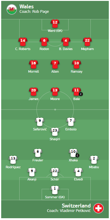 Швейцарія: Зоммер – Мбабу, Ельведи, Аканджі, Шер, Родрігес – Джака, Фройлер – Шакірі – Емболо, Сеферович.