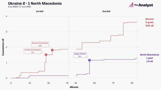За системою xG (очікувані голи) українці набрали 3.61, а команда Північної Македонії – 1.3. Виходить, підопічні Андрія Шевченка могли забивати ще як мінімум один м'яч.