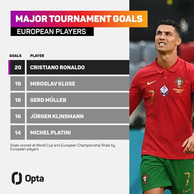 Роналду став першим гравцем в історії чемпіонатів світу і Європи, який забив у сумі 20 голів у цих двох змаганнях.
