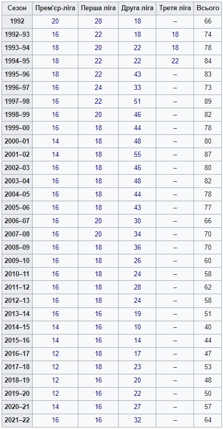 Кількість команд в українському футболі за сезонами