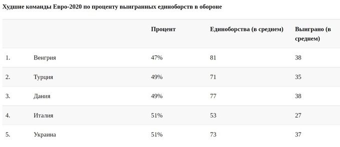 У всіх трьох матчах на Євро-2020 футболісти збірної України програвали своїм суперникам в єдиноборствах. У кожній грі у синьо-жовтих було по 47% виграних дуелей. Це один з найгірших показників на турнірі (у Швеції - такий же результат). Приблизно те ж саме можна сказати, якщо окремо аналізувати боротьбу в обороні.