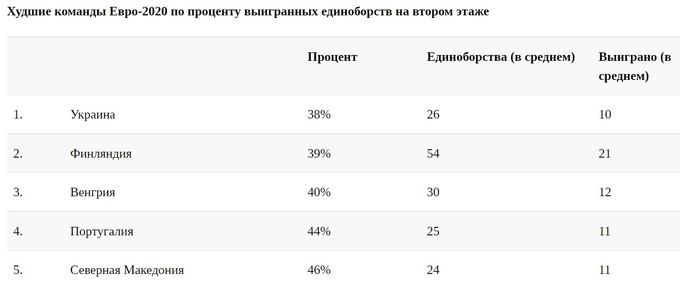Погано у нас йдуть справи і з єдиноборствами на другому поверсі. Тут ми взагалі на останньому місці. Похвально, що в матчах за участю збірної України не так багато повітряних дуелей, але в них потрібно теж виходити переможцем. Виходить, що синьо-жовті програють майже дві третини такої боротьби.