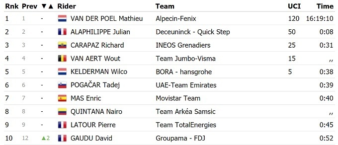 Лідером загального заліку залишився нідерландець Матьє Ван дер Пул з «Alpecin Fenix». Вчора четвертий етап виграв його партнер по команді Тім Мерлір.
