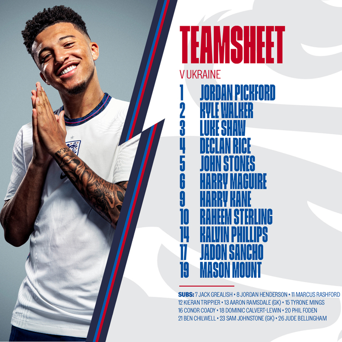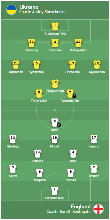 Англія: Пікфорд, Уокер, Стоунз, Магуайр, Шоу, Райс, Філліпс, Санчо, Маунт, Стерлінг, Кейн.