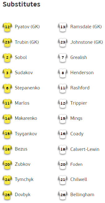 Запас: Пятов, Трубін, Соболь, Судаков, Степаненко, Марлос, Макаренко, Циганков, Безус, Зубков, Тимчик, Довбик.