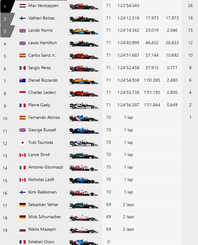 Топ-10: Ферстаппен, Боттас, Норріс, Хемілтон, Перес (+10 секунд штрафу), Сайнс, Ріккардо, Леклер, Гаслі, Алонсо