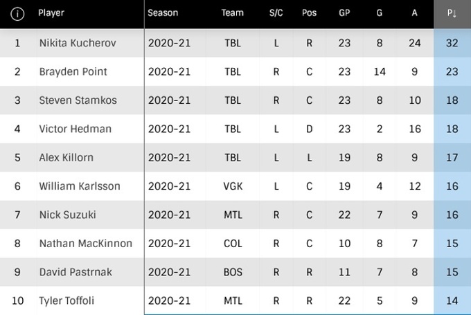 Гравці Тампи домінують у списку найкращих бомбардирів, займаючи всі позиції в топ-5: Кучеров (32), Поінт (23), Стемкос (18), Хедман (18), Кіллорн (17).