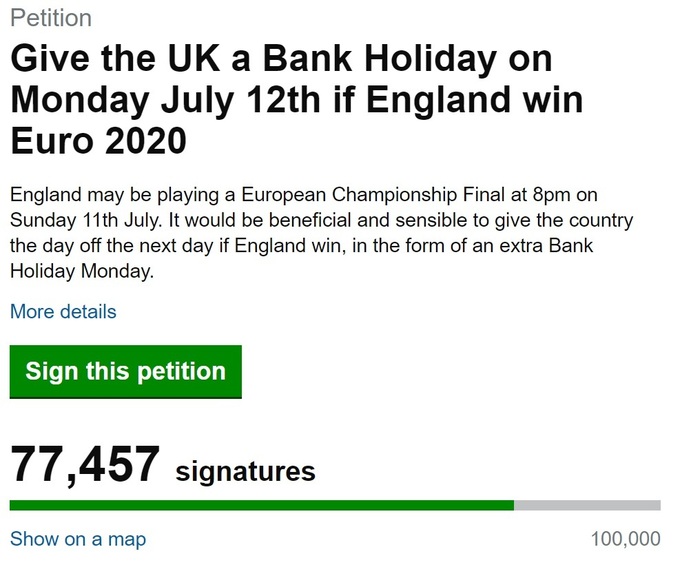 Вболівальники збірної Англії просять у уряду Великобританії отримати додатковий вихідний у разі перемоги збірної Англії в фіналі Євро-2020.
