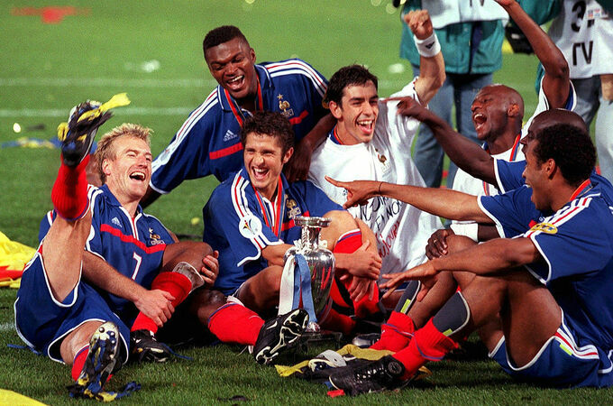 Чемпіони світу-1998 збірна Франції виграли й наступний після мундіалю розіграш чемпіонату Європи 2000 року. Чудова команда, в рядах якої виблискували Зідан, Вієйра, Анрі, Блан, Тюрам, Трезеге, Бартез та інші, з капітаном Дідьє Дешамом вийшла в плей-оф з другого місця в групі. Після цього французи з однаковим рахунком 2:1 обіграли Іспанію, Португалію та Італію, причому дві останні команди - в додатковий час. У фіналі проти італійців перемогу Франції й зовсім приніс «золотий гол» Давида Трезеге (тоді існувало правило, за яким овертайм припинявся відразу після того, як забивала одна з команд).