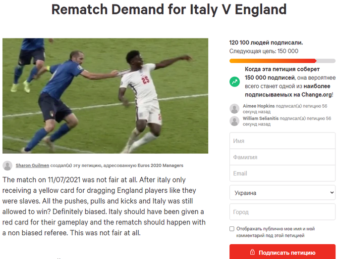 Петиція вже набрала більше 120 тисяч підписів. Фінальний матч в Лондоні обслуговував суддя Бьорн Кьойперс з Нідерландів.