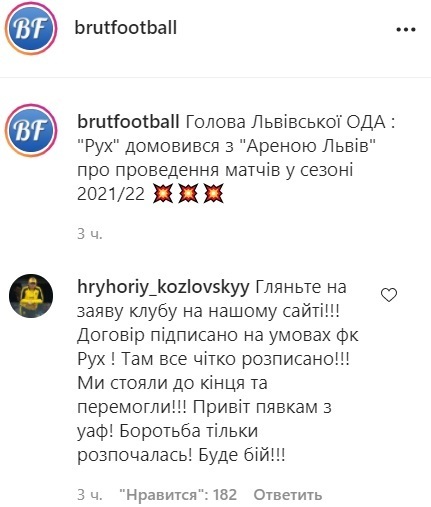 Президент «Руху» Григорій Козловський заявив, що його клуб на дуже вигідних умовах уклав новий договір оренди стадіону «Арена Львів».