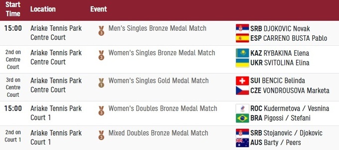 Світоліна (№6 WTA) зіграє матч за третє місце одиночного розряду проти Єлени Рибакіної з Казахстану (№20 WTA). Зустріч відбудеться другим запуском на центральному корті після поєдинку Джокович - Карреньо-Буста. Орієнтовний час початку матчу - 10:30 за Києвом