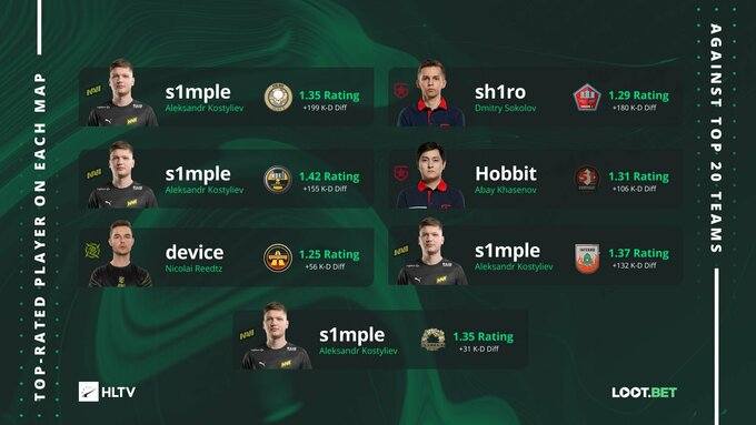 Снайпер складу Natus Vincere з CS:GO Олександр s1mple Костилєв лідирує по рейтингу на картах Dust2, Nuke, Ancient і Inferno. Про це повідомляє портал HLTV.