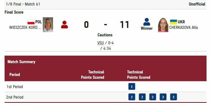 У ваговій категорії до 68 кг українка Алла Черкасова в 1/8 фіналу не залишила шансів польці Агнешці Вещек – 11:0.
