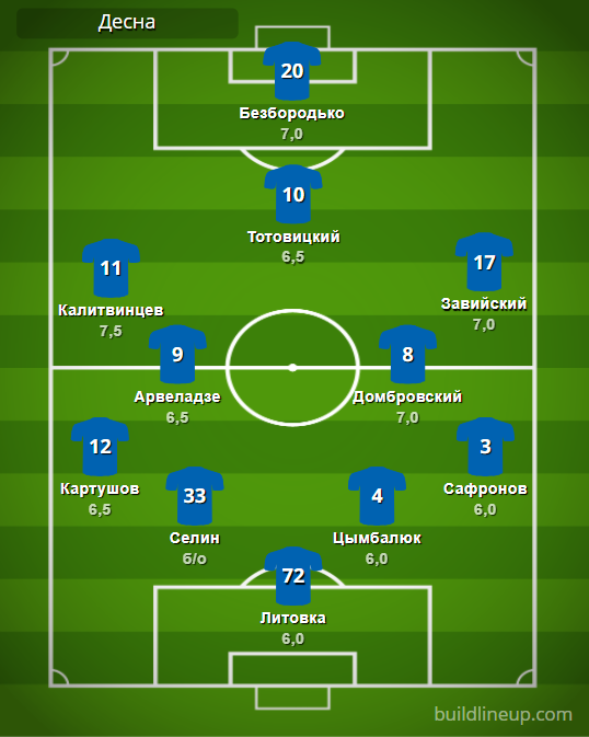 «Десна»: Литовка – Картушов, Селин (Волошин, 12, Масалов,74), Цимбалюк, Сафронов – Калітвінцев (Шевцов, 88), Арвеладзе, Домбровський, Завійський – Тотовицький – Безбородько (Будковский, 74).