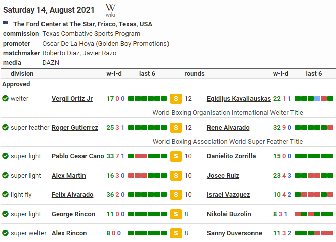 23-річний американець Вірджіл Ортіс (17–0, 17 KO), протеже Оскара Де Ла Хойї, буде захищати пояс, а претендентом є 33-річний Егідіюс Каваляускас з Литви (22–1–1, 18 KO). Явним фаворитом бою вважається Ортіс.