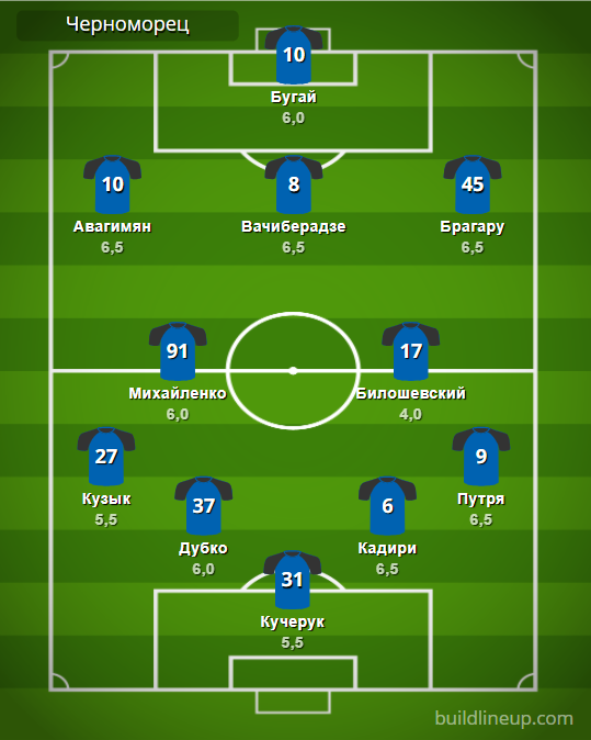 «Чорноморець»: Кучерук – Кузик, Дубко, Кадірі, Путря (Скорко, 84) – Михайленко, Білошевський – Авагімян (Тлумак, 78), Вачіберадзе (Кравченко, 78), Брагару (Ісаєнко, 68) – Бугай (Ванат, 68).