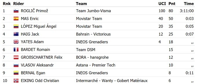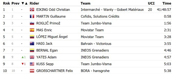 Лідерство в загальному заліку зберіг норвежець Одд Крістіан Ейкінг з «Intermarche Wanty Gobert». Марк Падун сьогодні фінішував 105-м з відставанням в 11 хвилин і 31 секунду.