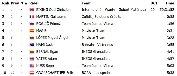 Червону майку лідера загального заліку зберіг норвежець Одд Крістіан Ейкінг з команди «Intermarche Wanty Gobert». Марк Падун з команди «Bahrain Victorious» сьогодні фінішував 118-м з відставанням в 1 хвилину і 39 секунд. У загальному заліку українець опустився на 67-му позицію.