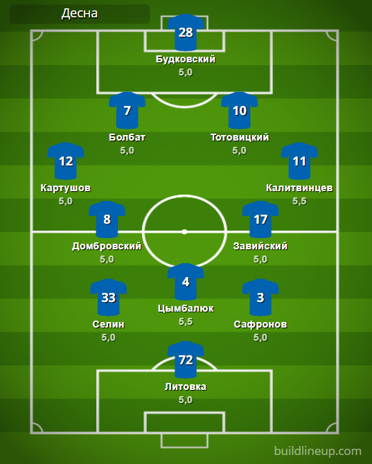 «Десна» (заміни): Арвеладзе – 5,5, Безбородько – 5,5, Волошин – б/о, Шевцов – б/о, Дегтярьов – б/о.