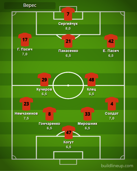 «Верес»: Когут – Немчанінов, Гончаренко, Мірошник, Солдат – Кучеров (Петько, 77), Кльоц (Полюлях, 68) – Г. Пасіч, Панасенко (Тимофієнко, 82), Є. Пасич – Сергійчук (Гечев, 82).