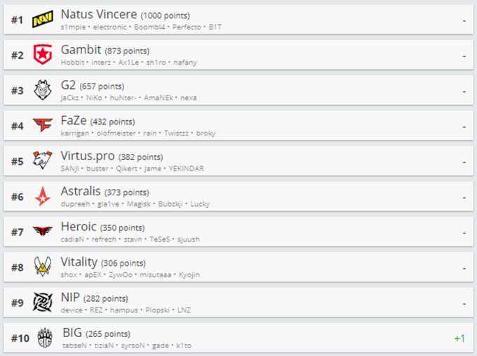 Першу сходинку продовжує утримувати склад української організації Natus Vincere. Олександр s1mple Костилєв і компанія мають максимальну кількість очок - 1000.