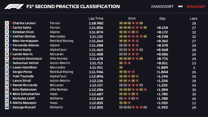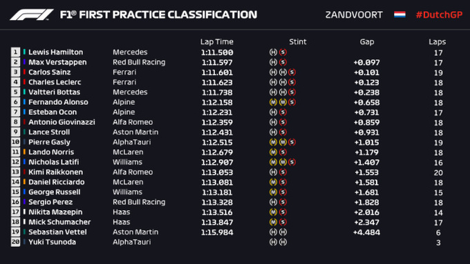 Незважаючи на очікування публіки, в першій практиці найкращим був Льюїс Хемілтон, який випередив Ферстаппена на 0,1 секунди. Цікаво, що топ-4 замкнули пілоти Феррарі.