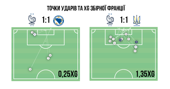 Франція за підсумками поєдинку завдала 8 ударів по воротах суперника, з яких лише 1 припав у площину. Показник очікуваних голів «триколірних» склав 0,25 - це найнижча цифра за останні 7 років виступів збірної Франції, причому для всіх матчів, як офіційних, так і неофіційних. Безумовно, показник xG може не бути для когось серйозним аргументом в силу своєї теоретичної специфіки, але для більшої наочності досить поглянути на точки ударів гравців збірної Франції в останньому матчі проти Боснії та Герцеговини і, наприклад, на ці ж дані, але в останній зустрічі «триколірних» з Україною.