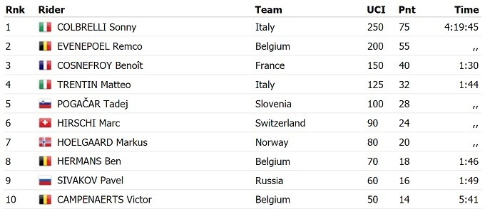 Сьогодні в італійському Тренто груповою гонкою серед чоловіків завершився чемпіонат Європи з шосейного велоспорту. Перемогу на домашній трасі здобув італієць Сонні Кольбреллі, який в фінішному спринті випередив бельгійця Ремко Евенпула. Для збірної Італії це четвертий поспіль титул чемпіонів Європи в груповій гонці.