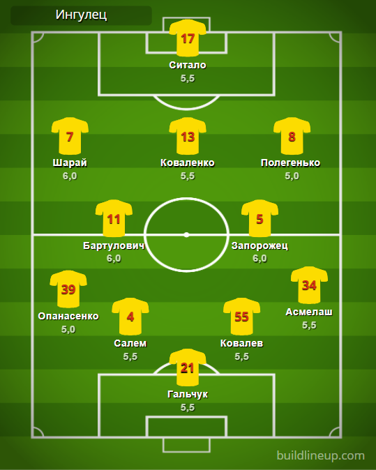 «Інгулець»: Гальчук – Опанасенко (Мельничук, 82), Салем, Ковальов, Асмелаш – Шарай (Головкін, 82), Бартуловіч (Коробенко, 74), Коваленко (Гопей, 64), Запорожець, Полегенько – Сітало (Плохотнюк, 74).