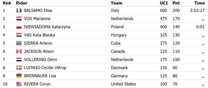 Італійська велогонщиця Еліза Бальзамо стала чемпіонкою світу 2021 року в груповій гонці. У фінішному спринті вона випередила нідерландку Маріанну Фос і польку Катаржину Невядому.