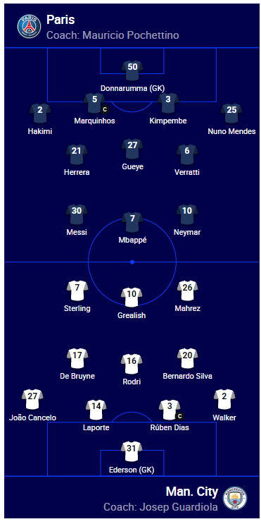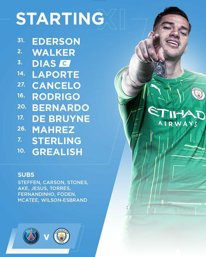 Манчестер Сіті: Едерсон, Вокер, Діаш, Ляпорт, Канселу, Сілва, Родрі, де Брюйне, Марез, Гріліш, Стерлінг.
