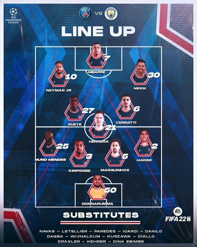ПСЖ: Доннарумма, Хакімі, Кімпембе, Маркіньос, Нуну Мендеш, Еррера, Маркіньос, Гуйє, Мессі, Мбаппе, Неймар.