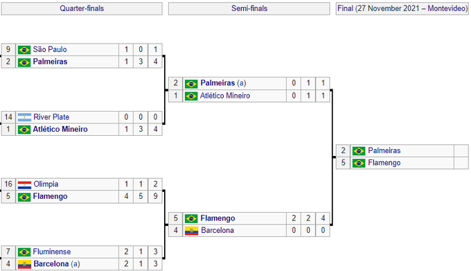 Гості здобули перемогу з рахунком 2:0 (4:0 за сумою двох матчів) і вийшли до фіналу турніру. Дублем відзначився Бруно Енріке. У вирішальному поєдинку «Фламенго» зустрінеться з ще одним бразильським клубом — «Палмейрасом». Раніше «Палмейрас» взяв гору над «Атлетіко Мінейро» завдяки голу на виїзді (0:0, 1:1).