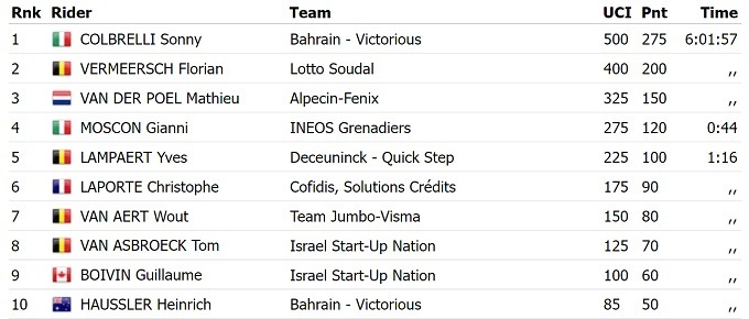 Італійський гонщик команди «Bahrain Victorious» Сонні Кольбреллі став переможцем легендарної одноденки Париж - Рубе-2021, яка проходила в дуже важких погодних умовах. Партнер Марка Падуна по команді в фінішному спринті випередив Флоріана Вермеерша і топ-фаворита Матьє Ван дер Пула.