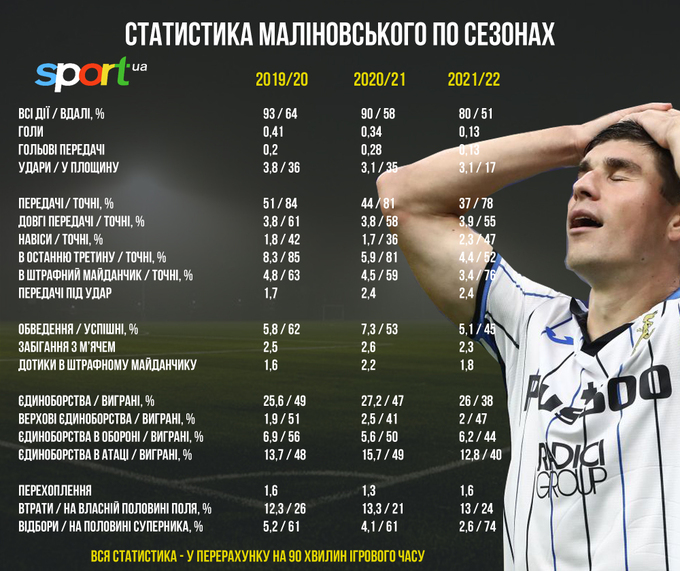 В аспекті Маліновського вже зараз можна чітко говорити, що найбільш вдалим в індивідуальному плані для хавбека був саме дебютний сезон в «Аталанті». Так, він дещо менше здійснював результативних дій в цей період, але й на полі знаходився в середньому менше. Нижче – розгорнута статистика Маліновського у двох останніх повних сезонах і на початку нинішнього, тобто, по суті, показники його кар'єри в «Аталанті», де український хавбек грає з літа 2019 року.