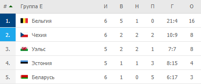 Бельгія впевнено лідирує в цій групі, набравши 16 очок з 18.