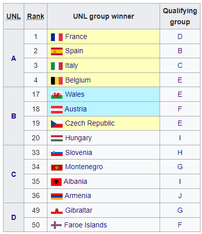 Переможцями груп Ліги націй 2020/21 стали (за рейтингом): Франція, Бельгія, Італія, Іспанія, Уельс, Австрія, Чехія, Угорщина, Словенія, Чорногорія, Албанія, Вірменія, Гібралтар, Фарери. Наразі в зоні плей-оф перебувають Уельс та Австрія.