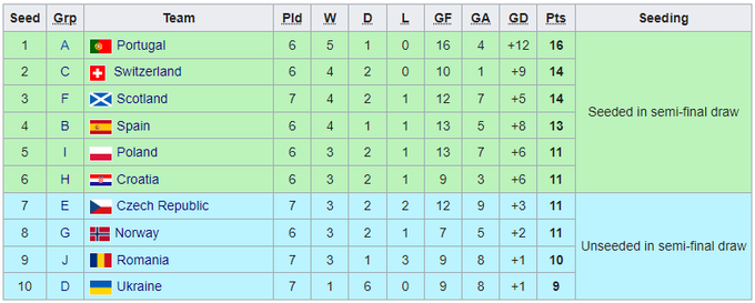 Згідно з регламентом плей-оф європейської кваліфікації шість других команд відбірних груп із найкращим рейтингом будуть сіяними. При цьому для рейтингу не враховуватимуться їхні матчі проти шостих команд у кожній групі.