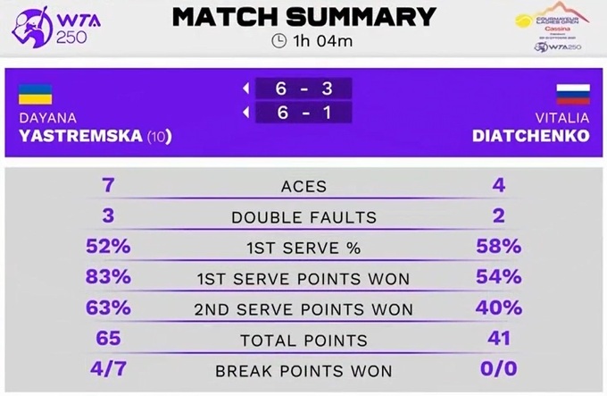 Даяна зіграла 12-й матч на рівні WTA з суперницями з Росії, здобула сьому перемогу.