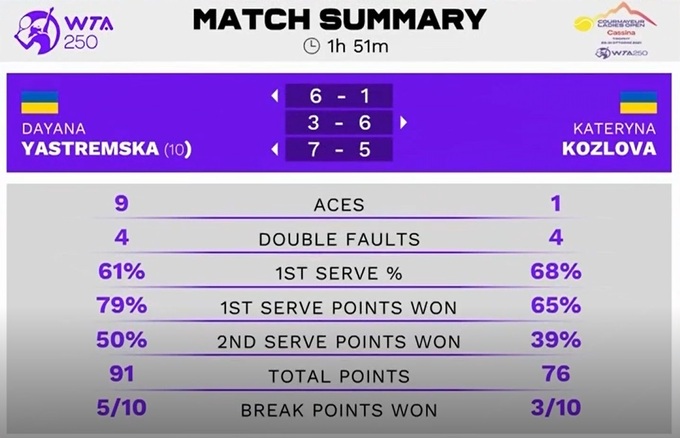 Даяна Ястремська (Україна) – Катерина Козлова (Україна) – 6:1, 3:6, 7:5
