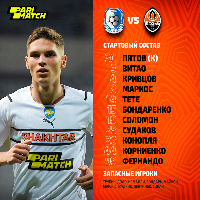 О 19:30 розпочнеться матч Кубка України між «Чорноморцем» та «Шахтарем». Наставник Роберто Де Дзербі дав шанс молодим Коноплі, Бондаренку та Судакову.