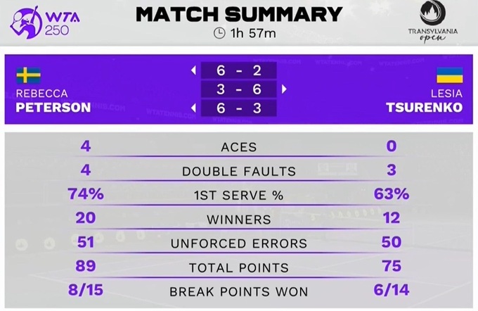 Леся Цуренко (Україна) – Ребекка Петерсон (Швеція) – 2:6, 6:3, 3:6