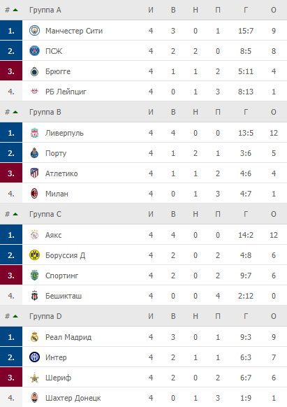 Після невдачі у Мадриді (1:2) «Шахтар» замикає турнірну таблицю (1 очко). Попереду Реал (9) та Інтер (7), на третій позиції – «Шериф» під керівництвом Юрія Вернидуба (6 балів).