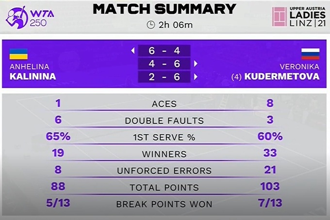 Ангеліна Калініна (Україна) – Вероніка Кудерметова (Росія) – 6:4, 4:6, 2:6