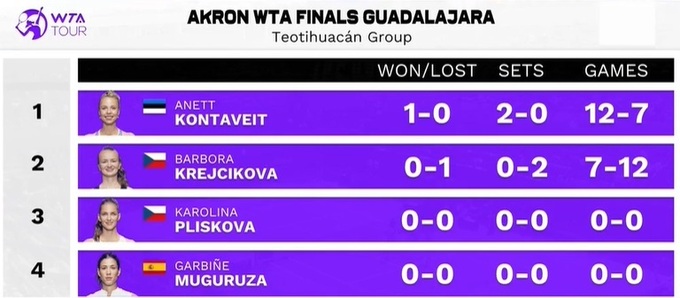 У першій зустрічі групи Теотіуакан чешка Барбора Крейчикова у двох сетах програла естонці Анетт Контавейт.