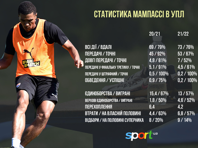 Враховуючи дуже пристойні показники Мампассі в єдиноборствах (хоча зріст 184 сантиметри не є відверто сильною стороною центрбека), статистика у 18-річного таланта за мірками УПЛ справді дуже хороша, що в сукупності з іншими факторами робить цього гравця цікавим на трансферному ринку.