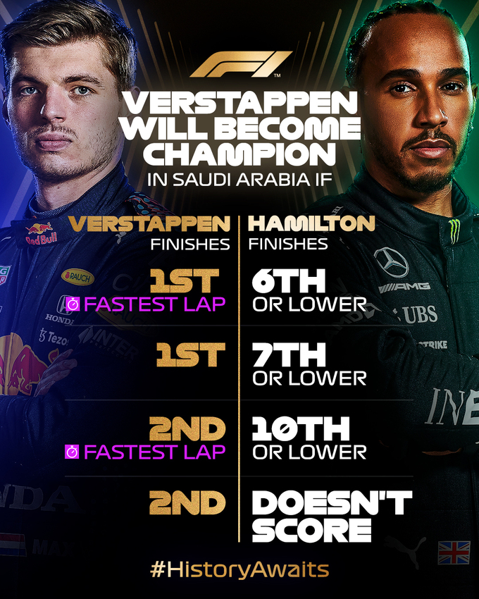 Незважаючи на дві поспіль перемоги пілота Мерседеса Льюїса Хемілтона, гонщик Ред Булла Макс Ферстаппен вже за підсумками Гран-прі Саудівської Аравії може оформити чемпіонський титул.
